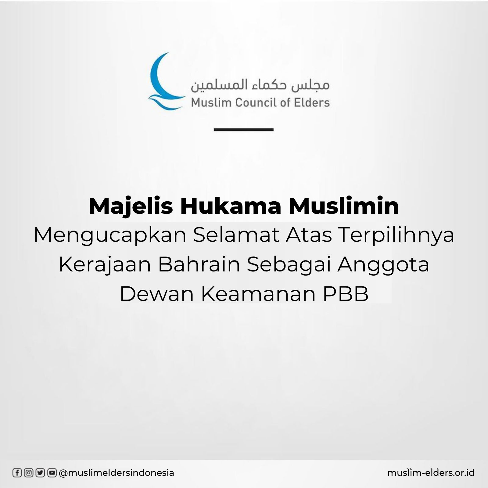 Baca selanjutnya>Majelis Hukama Muslimin (MHM) yang dipimpin Grand Syekh Al-Azhar, Imam Akbar Prof. Dr. Ahmed al-Tayyeb menyampaikan ucapan selamat atas terpilihnya Kerajaan Bahrain sebagai anggota tidak tetap Dewan Keamanan Perserikatan Bangsa-Bangsa (DK PBB) untuk periode 2026–2027, setelah memperoleh dukungan internasional yang luas dengan lebih dari 186 suara. Ucapan selamat ini disampaikan kepada Kerajaan Bahrain di bawah kepemimpinan Raja Hamad bin Isa Al Khalifa, juga kepada pemerintah dan seluruh rakyat Bahrain.