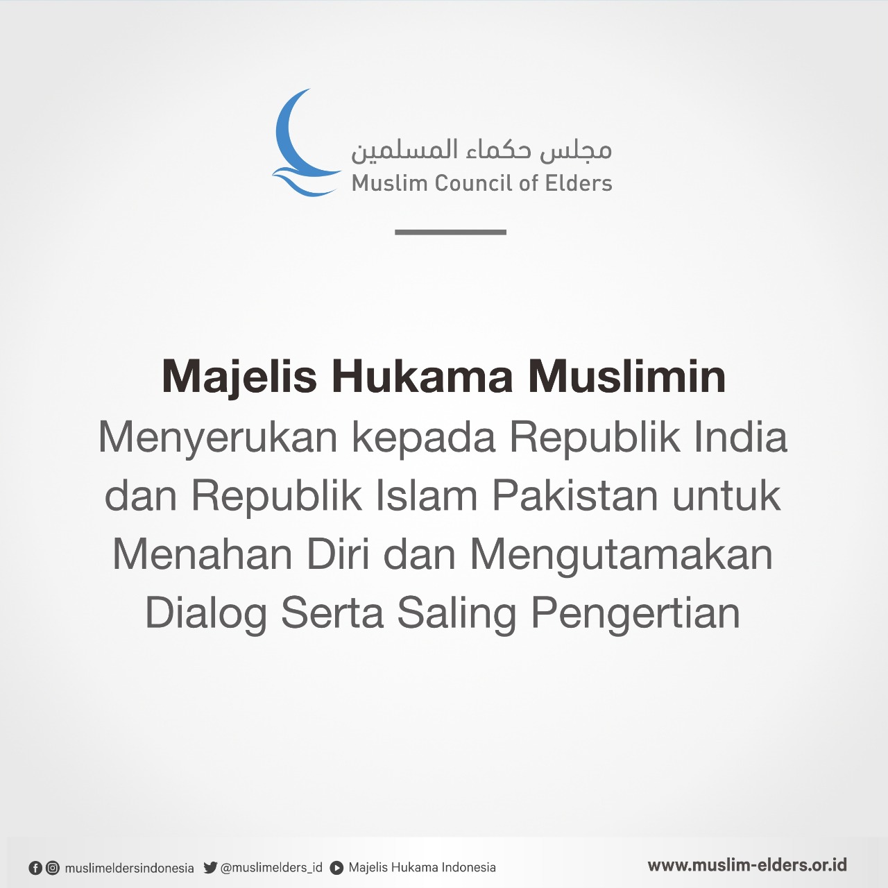 Baca selanjutnya>Majelis Hukama Muslimin (MHM), yang diketuai Grand Syekh Al Azhar, Imam Akbar Prof. Dr. Ahmed Al-Tayeb, menyerukan kepada Republik India dan Republik Islam Pakistan untuk menahan diri dan meredakan ketegangan, serta menghindari terjerumus ke jurang perang—yang akan membahayakan keamanan dan stabilitas kedua negara, rakyat mereka, dan dunia yang lebih luas.