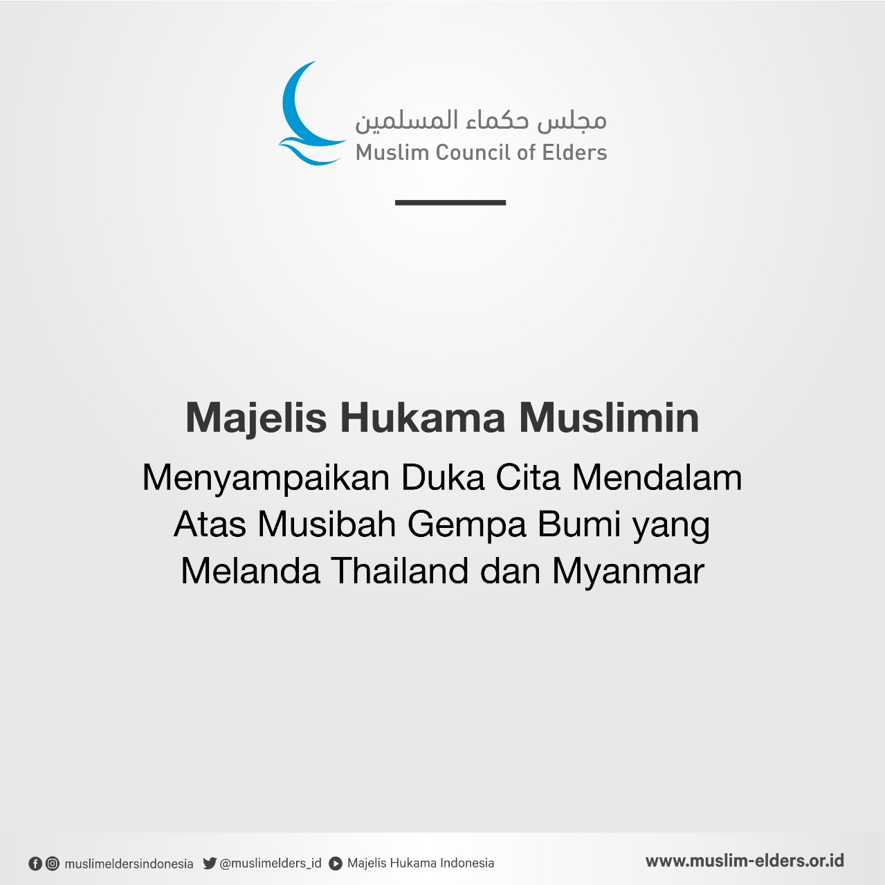 Majelis Hukama Muslimin (MHM), di bawah kepemimpinan Grand Syekh Al Azhar, Imam Akbar Profesor Dr. Ahmed Al-Tayeb, menyampaikan solidaritasnya dengan Kerajaan Thailand dan Republik Myanmar setelah gempa bumi dahsyat yang melanda kedua negara tersebut. Perisitiwa itu mengakibatkan hilangnya ratusan nyawa dan banyak korban luka-luka.