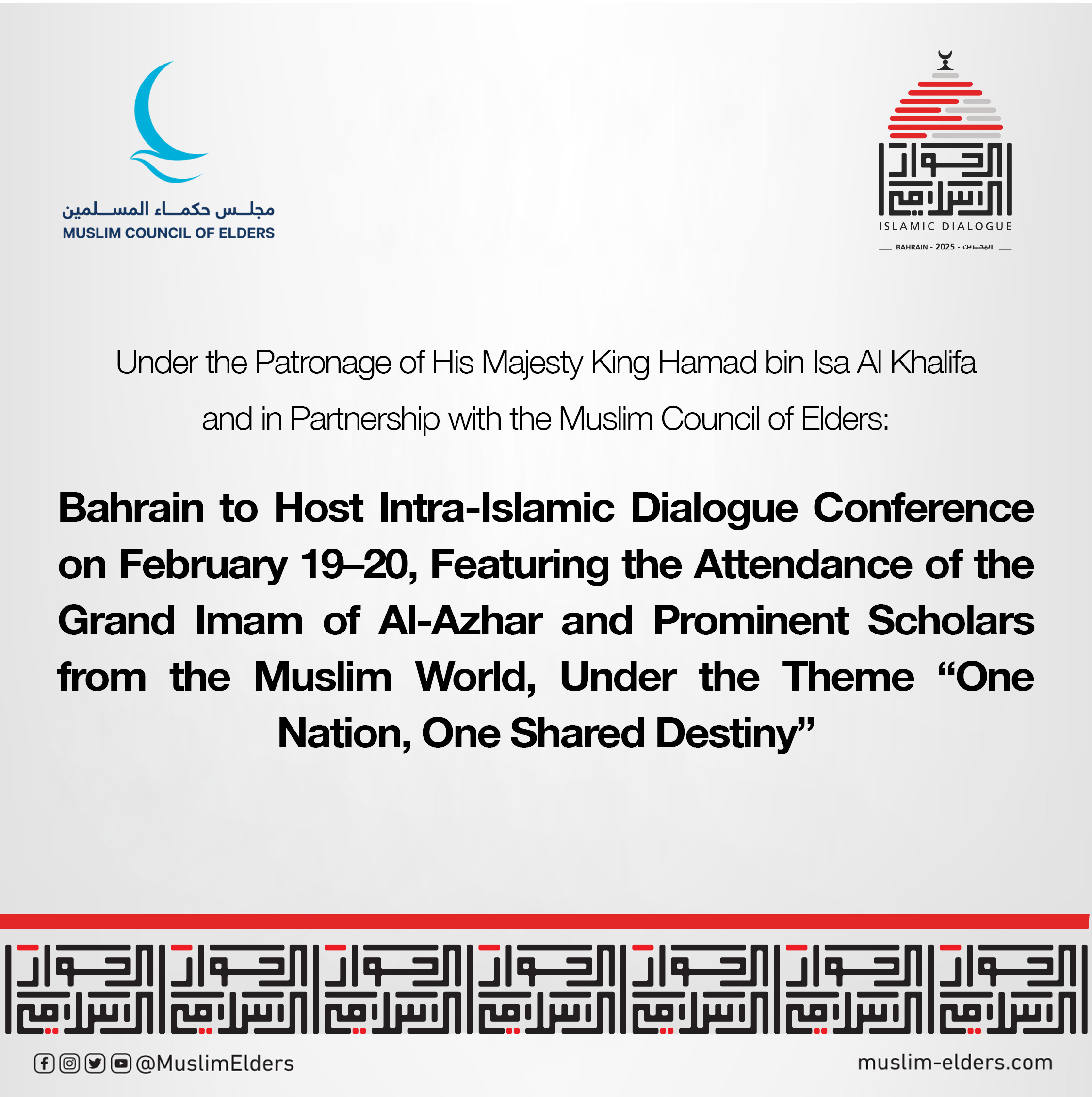 Baca selanjutnya>Kerajaan Bahrain akan menjadi tuan rumah Konferensi Dialog Intra-Islam pada 19–20 Februari 2025. Penyelenggaraan Konferensi ini mendapat dukungan penuh dari Raja Bahrain, Hamad bin Isa Al Khalifa. Konferensi ini diselenggarakan atas kerja sama Al-Azhar Al-Syarif, Dewan Tertinggi Urusan Islam di Bahrain, dan Majelis Hukama Muslimin (MHM), dengan tema, "Satu Bangsa, Satu Nasib Bersama."