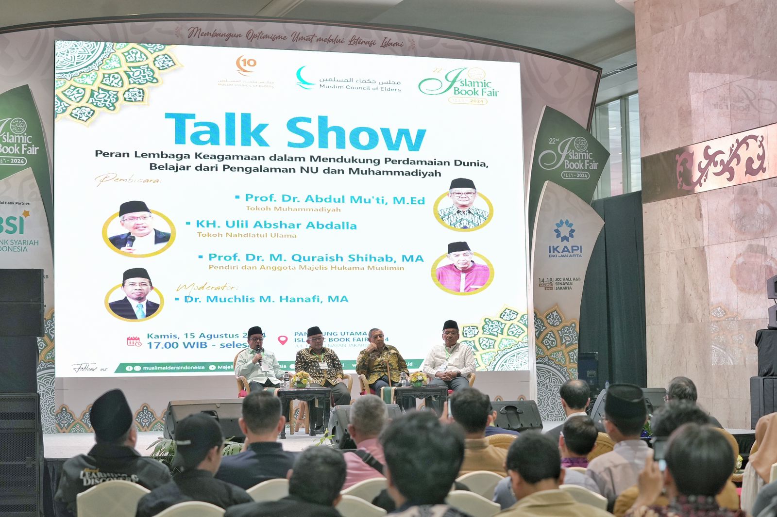 Baca selanjutnya>Majelis Hukama Muslimin (MHM) kembali menggelar talkshow pada Islamic Book Fair 2024 di Jakarta Convention Center (JCC) Hall, Senayan, Sabtu (17/8/2024). Talkshow pada hari keempat pameran buku keislaman terbesar di Indonesia ini mengangkat tema Peran Agama Promosikan Budaya.