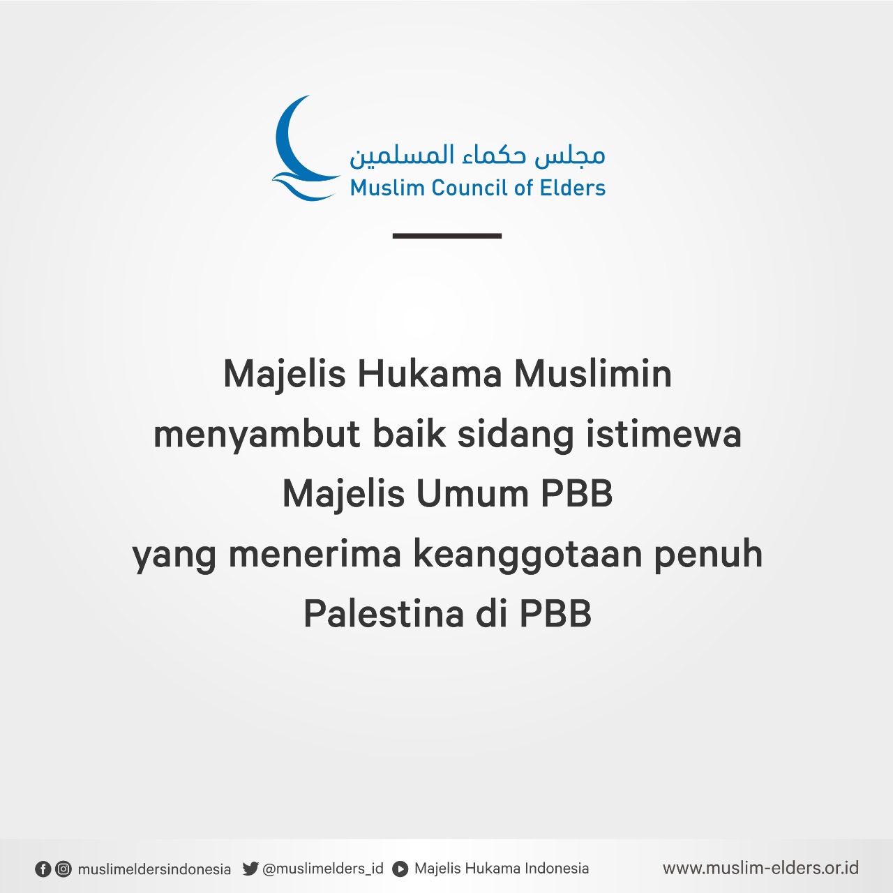 Baca selanjutnya>Majelis Hukama Muslimin (MHM), di bawah kepemimpinan Grand Syekh Al Azhar, Imam Akbar Dr. Ahmed Al-Tayeb, menyambut baik diadopsinya rancangan resolusi yang diajukan Uni Emirat Arab atas nama Kelompok Arab. Resolusi yang mendapat banyak tanggapan positif dan dukungan 143 dari 193 negara ini menyerukan keanggotaan sah Negara Palestina di Majelis Umum Perserikatan Bangsa-Bangsa.