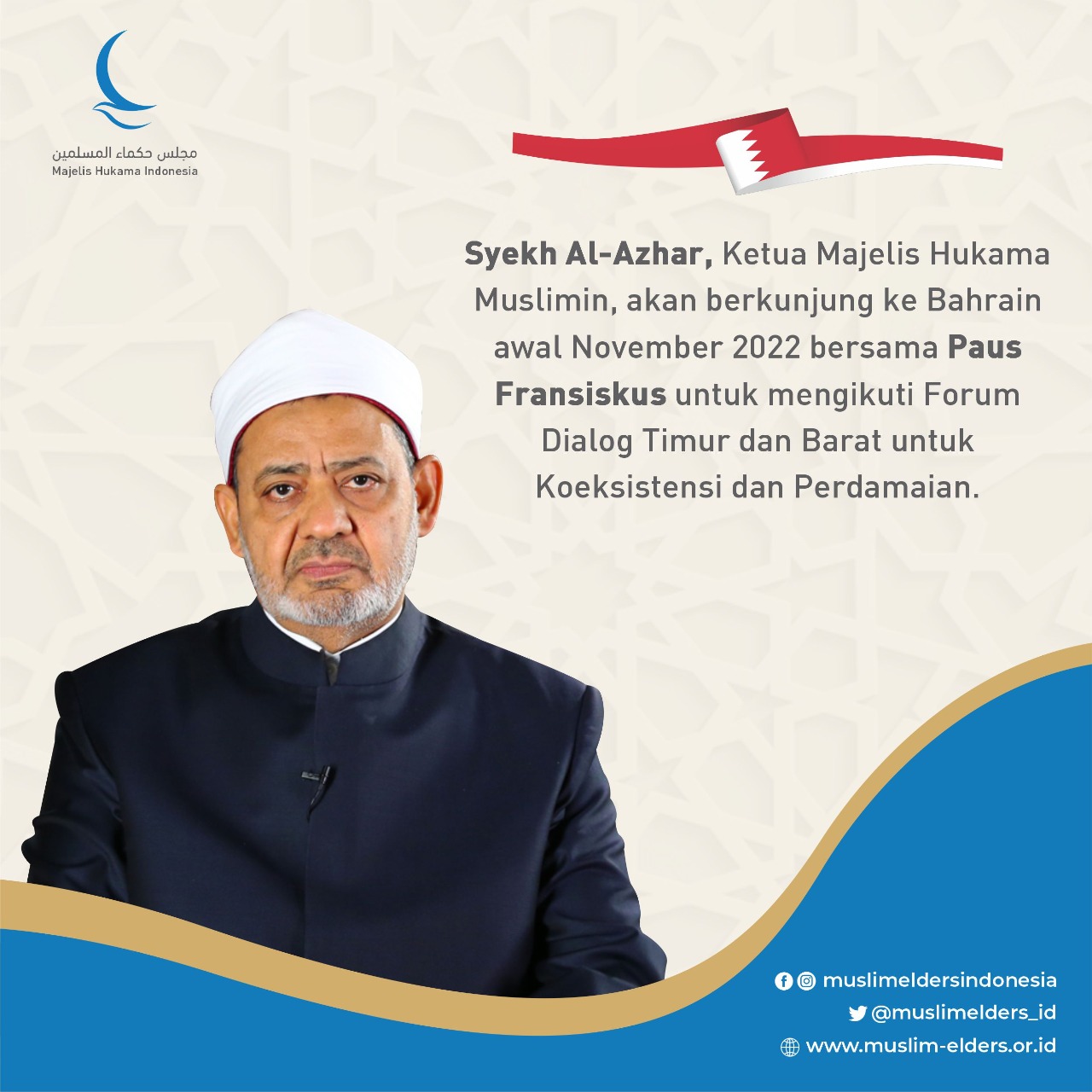 Baca selanjutnya>Atas undangan Raja Bahrain, Syekh Al-Azhar yang juga Ketua Majelis Hukama Muslimin (MHM), Imam Akbar Ahmed Al Tayeb akan mengunjungi Bahrain pada awal November 2022. Kunjungan ini dalam rangka menghadiri Forum Dialog Bahrain yang pertama tentang “Dialog Timur dan Barat untuk Koeksistensi Manusia”.