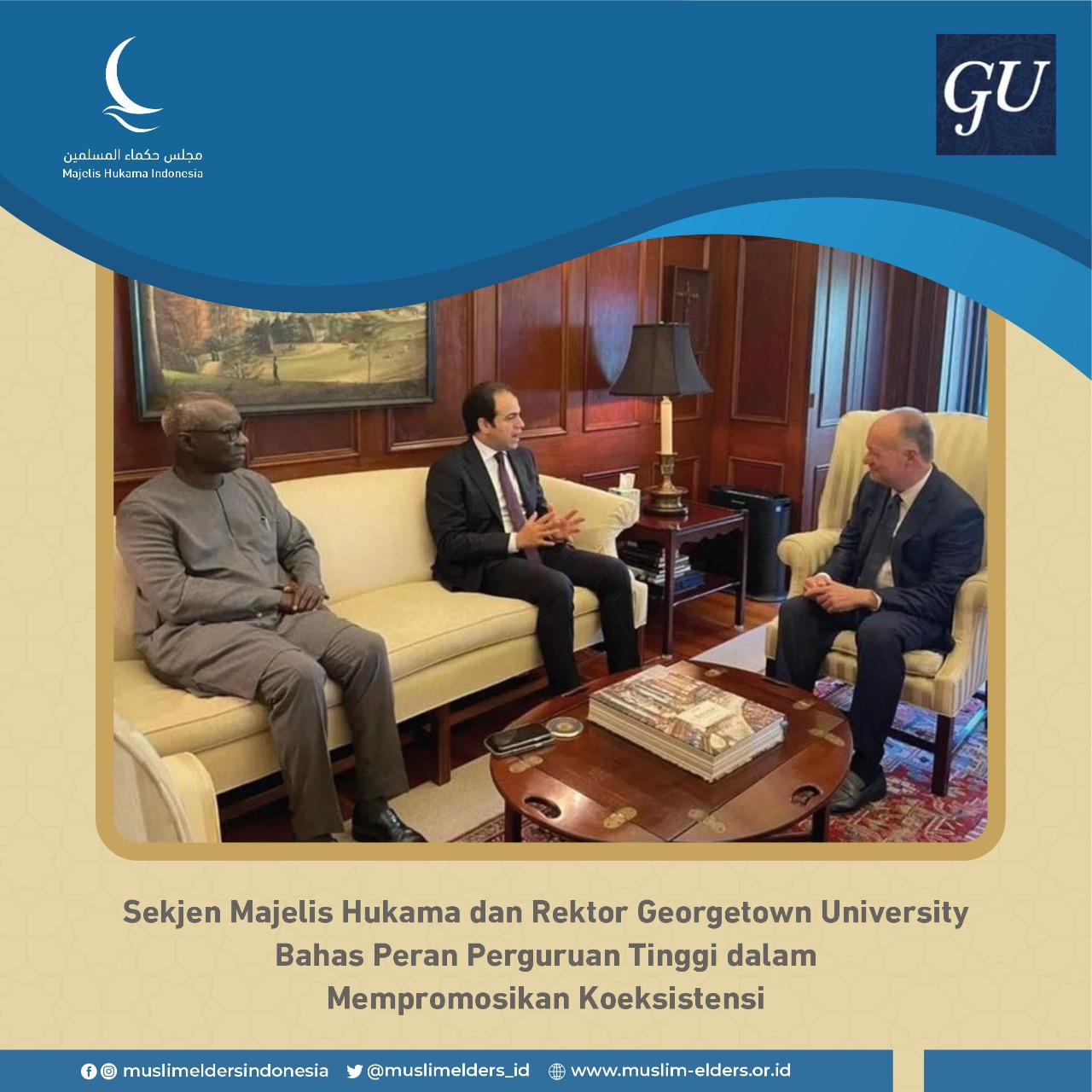 Baca selanjutnya>Sekretaris Jenderal Majelis Hukama Muslimin (MHM) Mohamed Abdel Salam bertemu dengan Rektor Georgetown University (GU) John J. DeGioia di kampus perguruan tinggi tersebut, Senin (19/9/2022). Pertemuan itu berlangsung di sela-sela penyelenggaraan forum “Penguatan Solidaritas Manusia” yang diselenggarakan di kampus GU dan dihadiri mahasiswa dari berbagai perguruan tinggi di Washington, Amerika Serikat, dan dari belahan dunia lain.