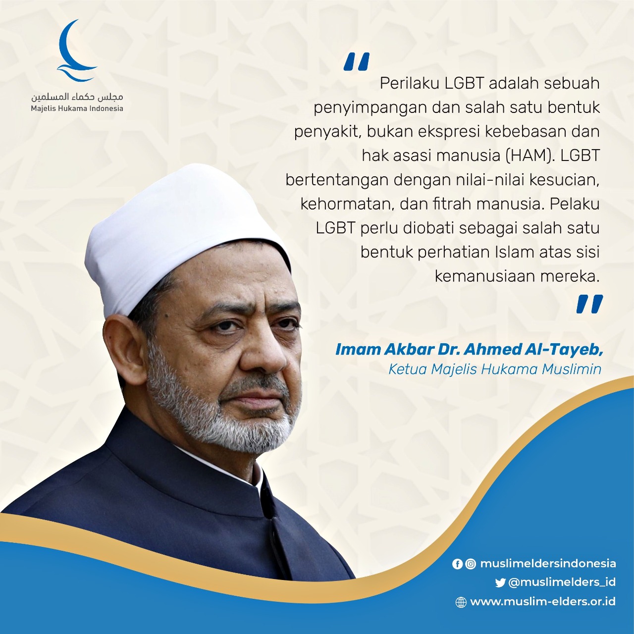 Baca selanjutnya>Imam Akbar Al-Azhar yang juga Ketua Majelis Hukama Al-Muslimin (MHM) Ahmad Al Tayeb berpandangan bahwa lesbian, gay, biseksual, dan transgender (LGBT) termasuk jenis penyimpangan dan penyakit seks atau syudzuz jinsiyah wa amradh al-jins. Berkenaan dengan itu, Imam Akbar menilai pelaku LGBT harus diobati.