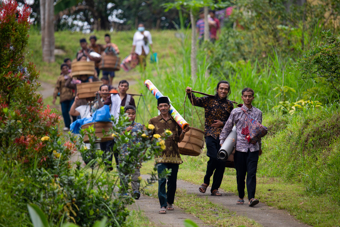 Makam itu berjarak sekitar 1 km dari titik keberangkatan masing-masing warga dusun. Mereka berjalan membentuk barisan menyusuri kontur tanah yang menanjak dan menurun, sembari membawa beragam makanan yang akan disantap bersama usai mendoakan para leluhur.