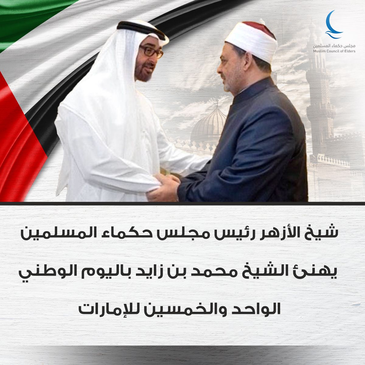 Baca selanjutnya>Grand Syekh Al-Azhar yang juga Ketua Majelis Hukama Muslimin (MHM), Imam Akbar Prof. Dr. Ahmed Al-Tayeb, menyampaikan ucapan selamat kepada Sheikh Mohammed bin Zayed Al Nahyan (MBZ), Presiden Uni Emirat Arab (UEA), berkenaan Peringatan Hari Nasional ke-51 UEA.