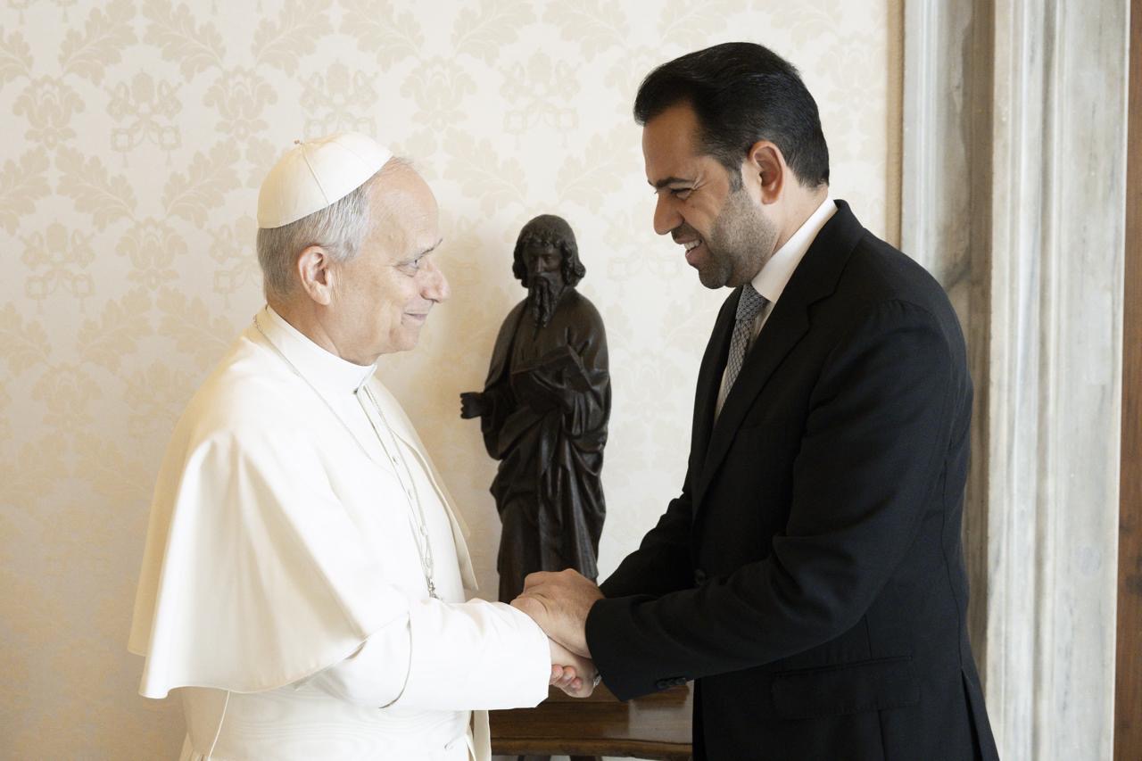 Baca selanjutnya>Pemimpin tertinggi Gereja Katolik Sri Paus Leo XIV menerima Sekretaris Jenderal Majelis Hukama Muslimin (MHM) Konselor Mohamed Abdelsalam di Istana Kepausan, Vatikan, Senin (25/8/2025). Dalam kesempatan itu, Abdelsalam menyampaikan salam dari Ketua MHM yang juga Grand Syekh Al-Azhar, Imam Akbar Prof. Dr. Ahmed Al-Tayeb.