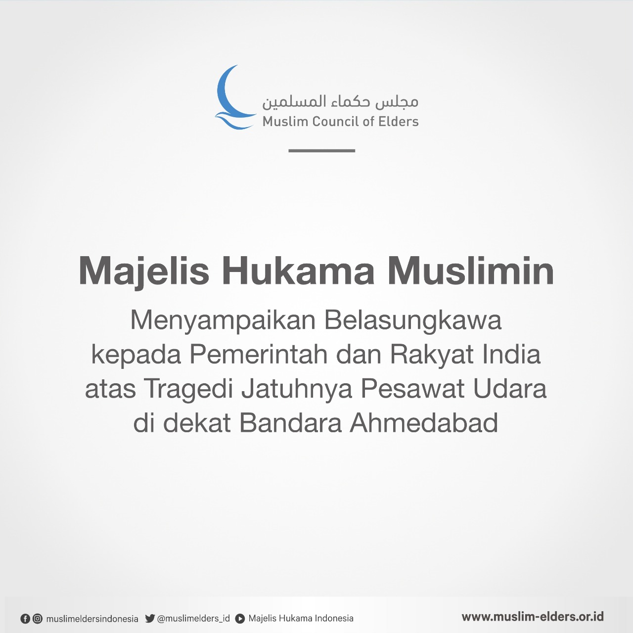 Baca selanjutnya>Majelis Hukama Muslimin (MHM), di bawah kepemimpinan Grand Syekh Al Azhar, Imam Akbar Profesor Dr. Ahmed Al-Tayeb, Kamis (12/6/2026), menyampaikan belasungkawa yang tulus kepada Republik India setelah kecelakaan tragis pesawat Air India di dekat Bandara Ahmedabad. Kejadian ini mengakibatkan hilangnya puluhan nyawa.