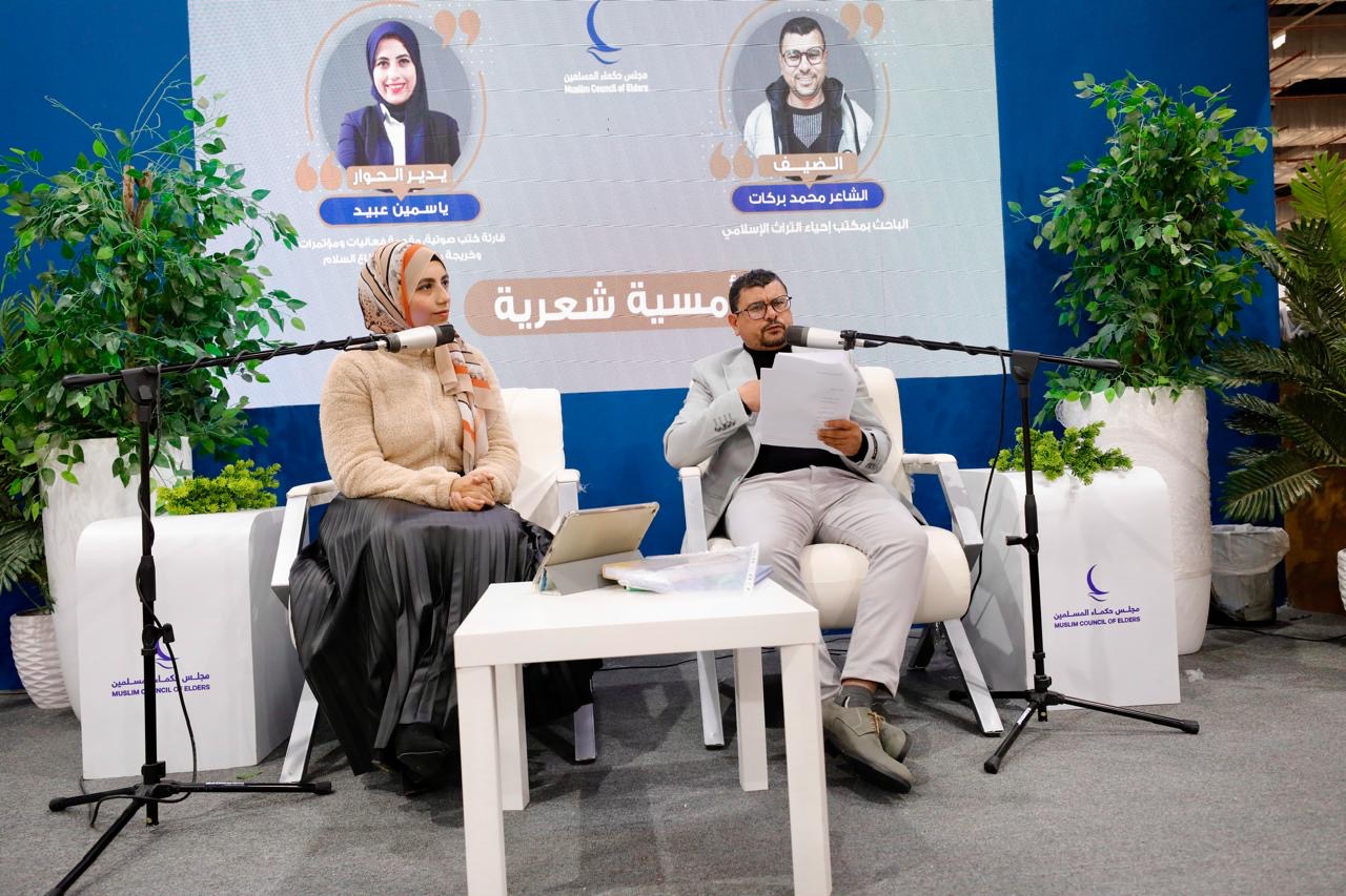 Baca selanjutnya>Sebagai bagian dari kegiatan budaya di Pameran Buku Internasional Kairo, stan Majelis Hukama Muslimin (MHM) menggelar malam puisi, Jumat (31/1/2025). Acara tersebut menampilkan penyair Mohammed Barakat, seorang peneliti di Kantor Pemulihan Warisan Islam di Al-Azhar. Selaku moderator, Yasmin Obeid, seorang peserta Forum Pembawa Damai Baru (EPF).