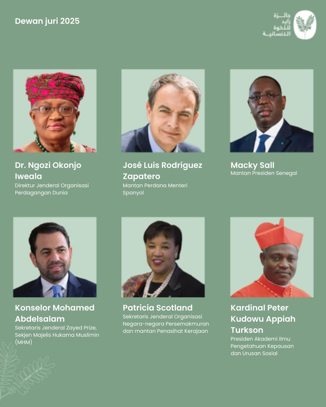 Dewan juri yang terpilih pada Zayed Award for Human Fraternity 2025 diumumkan pada Jumat, (18/10/2024). Ada sejumlah anggota baru yang mewakili enam negara dan berbagai bidang termasuk diplomasi, ekonomi, sains, pembangunan perdamaian, dan hukum.