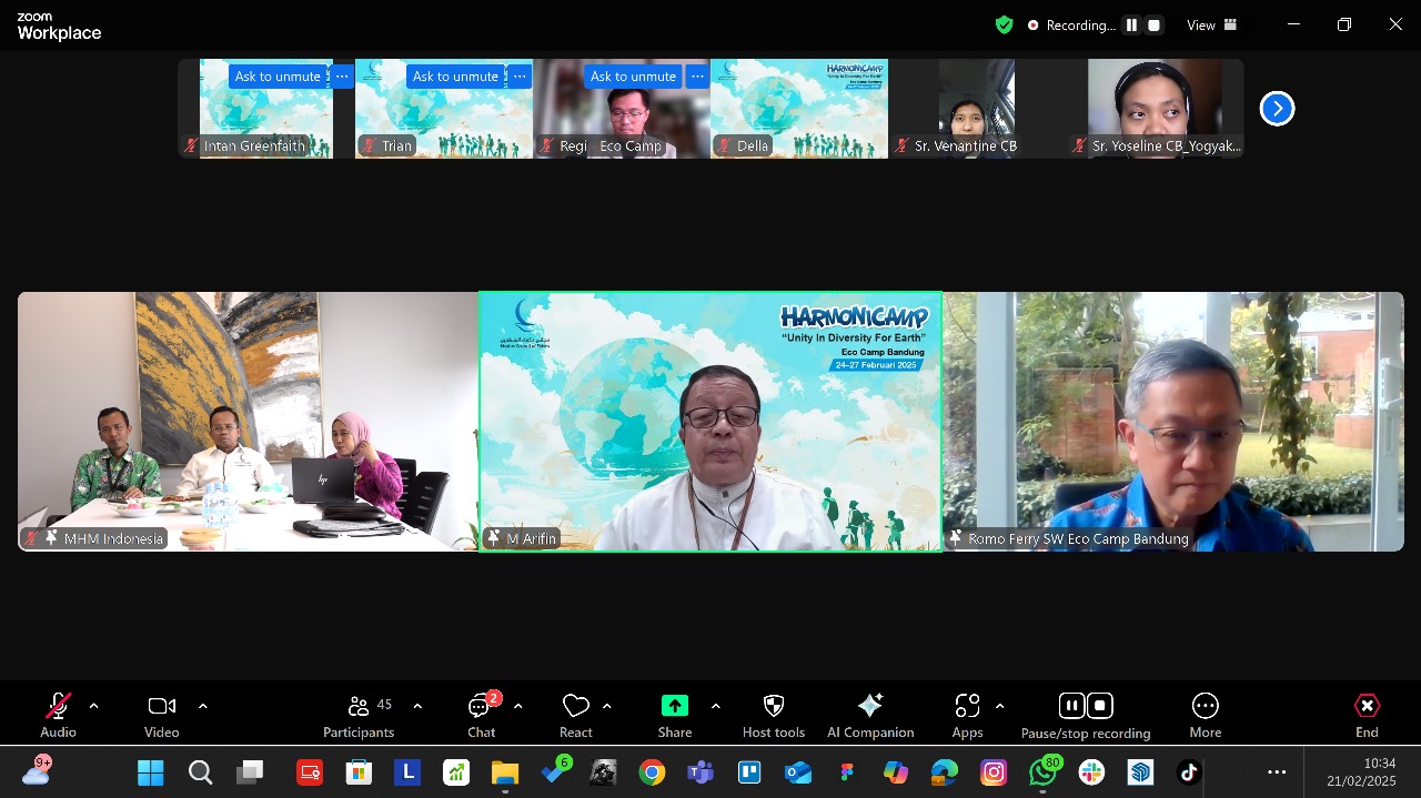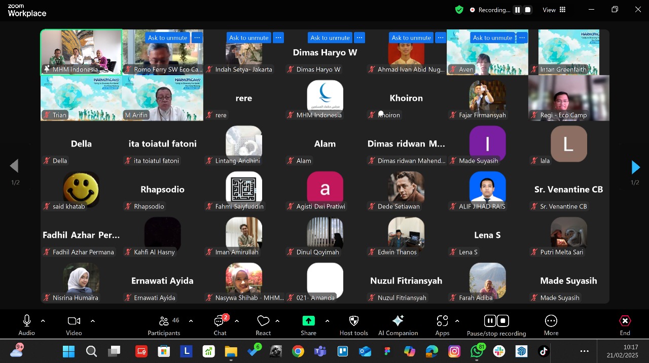 Pertemuan peserta peserta dan narasumber Harmony Camp ini digelar secara hybrid, daring dan luring. Para peserta mengikuti secara online, sementara sejumlah narasumber hadir di kantor MHM cabang Indonesia di Jakarta. Hadir antara lain, Koordinator Nasional Greenfaith Indonesia Hening Parlan dan perwakilan dari Jaringan Gusdurian Suraji. Sementera bergabung secara online, Direktur PPI Unnas Dr Fakhrudin Mangunjaya, dan pendiri Eco Camp Bandung yang akan menjadi tuan rumah acara, Dr Fery Sutrisna Wijaya.